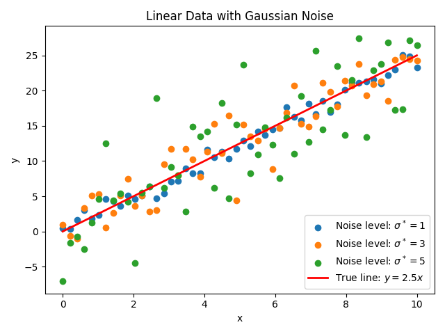 図2: 関数 \(y=2.5x\) から生成し、レベル \(\sigma^*=1,3,5\) のガウスノイズを付加した人工データ(data_gen.py で生成。デフォルト出力は data.png)。¶